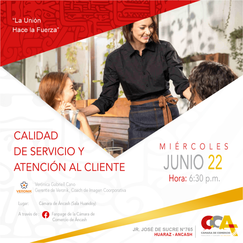Este miércoles 22 de junio, los invitamos a participar de la conferencia presencial «Calidad de Servicio y Atención al Cliente», a las 6:30 p.m., a cargo de la Lic. Verónica Gabriell Cano, gerente de Veronik. En la sala Huandoy de la Cámara de Comercio de Áncash.