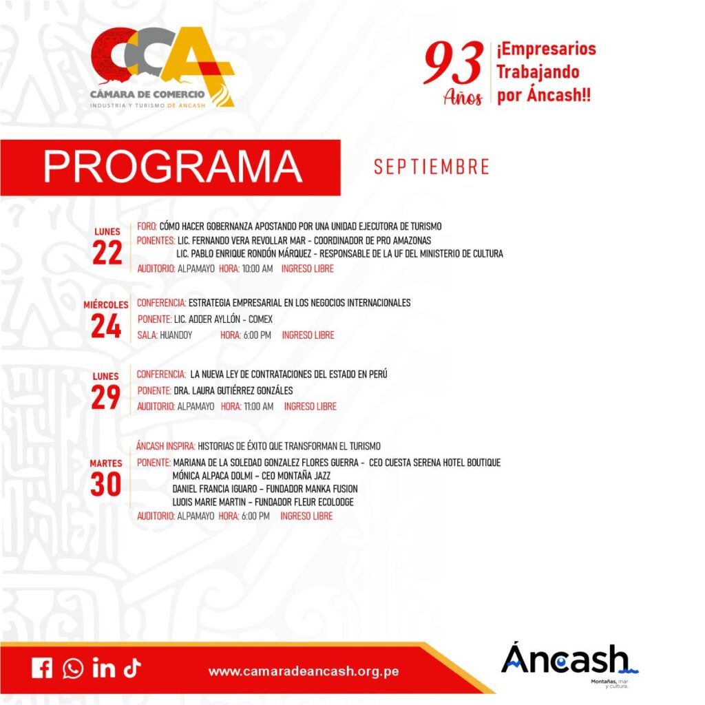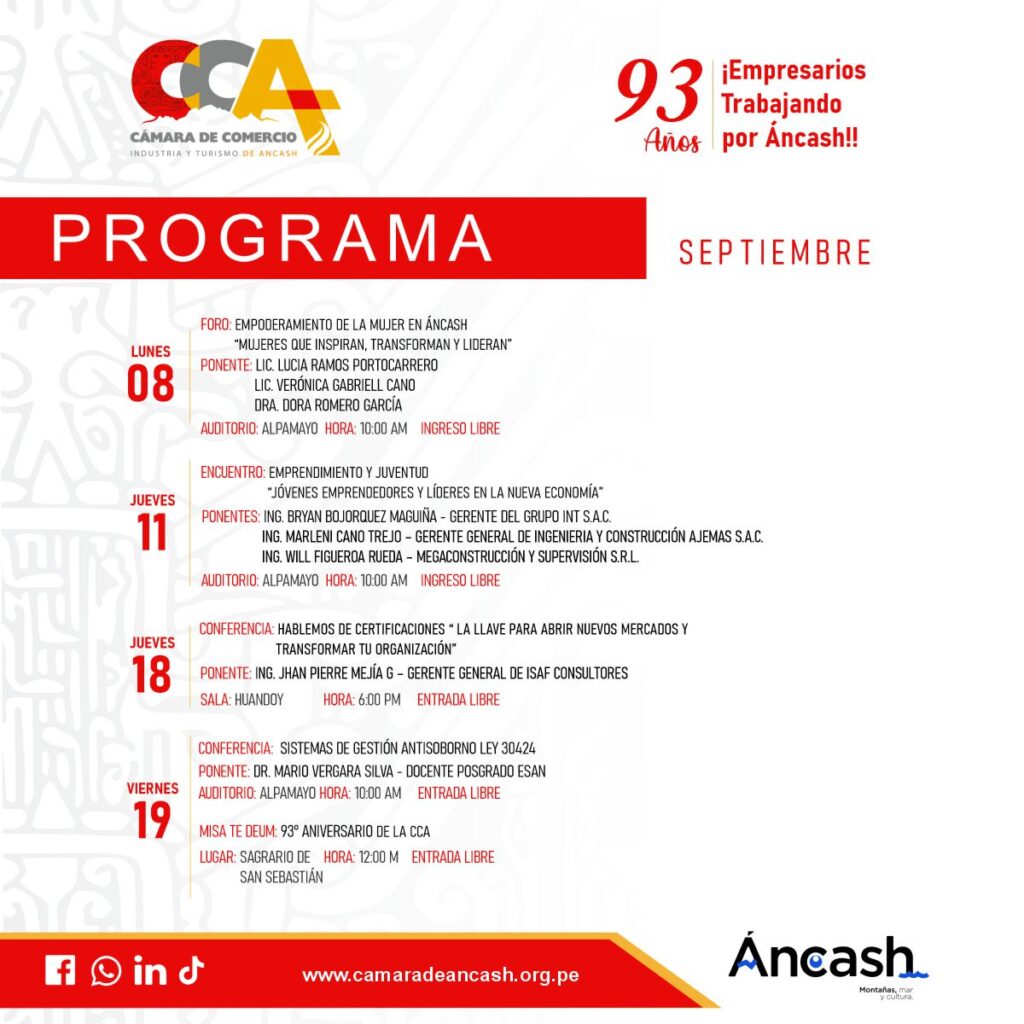 La Cámara de Comercio de Áncash (CCA) tiene el honor de invitar a la población en general a participar de las diversas actividades programadas en el marco de su 93° aniversario institucional, que se desarrollarán con el propósito de fortalecer la integración empresarial, promover la innovación y resaltar el potencial económico, turístico y cultural de nuestra región.