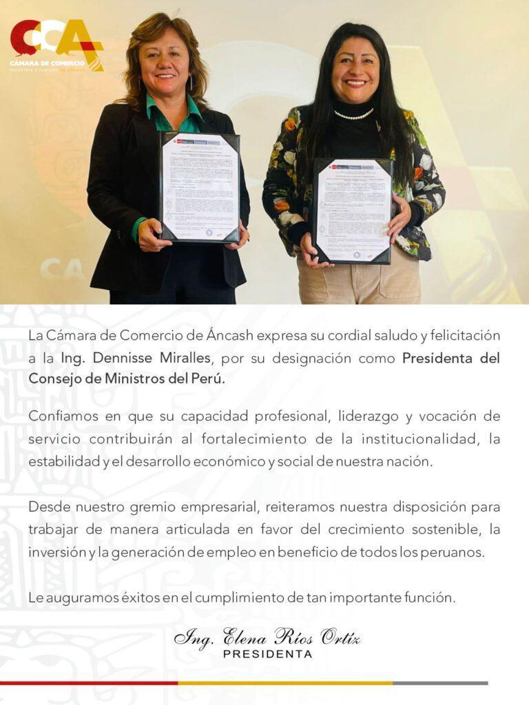 La Ing. Elena Ríos Ortiz, presidenta de la Cámara de Comercio, Industria y Turismo de Áncash, felicita a la Ing. Denisse Miralles por asumir la Presidencia del Consejo de Ministros y le expresa sus mejores deseos de éxito en tan alta responsabilidad al servicio del país.
